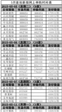 5月份首批新股总共25只,其中,沪市主板10只,深市创业板12只、中小板3只。网上申购时间集中于下周,下周总共有24只,其中,5月5日(周二)有9只,5月6日(周三)有10只,5月7日(周四)有5只。另外,5月11日(周一)还有1只新股发行(具体网上申购时间见表格)。