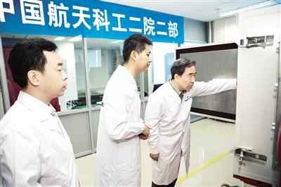 于本水院士(右一)在位于北京的中国航天科工集团第二研究院同科研人员讨论问题。 新华社记者 金立旺摄