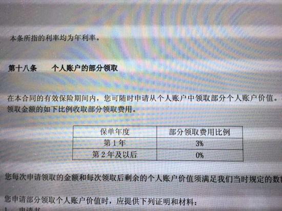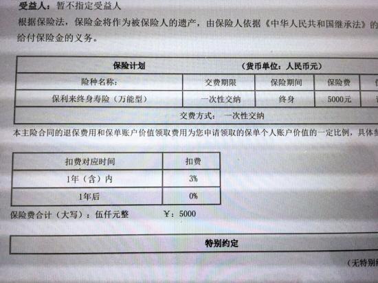 与其他渠道购买的万能险不同的是,上述保单合同中很明确地提到了第一年退保费用的比例为3%,第二年及以后退保费用则为零。这就意味着,李小姐只要持有保单满一年或以上,预期收益6.5%是可以实现的。当然,她很清楚6.5%只是预期收益,按照合同规定,万能险的本质是一份保险合同,它的保底利率是2.5%。“不过我觉得问题不大,这也是买万能险必须承担的风险。按照我对万能险的了解,一般保险公司的平均收益率都有4%-5%,在有收益的同时还有一份保险作为保障,对于有些闲钱没地方放、对收益率要求又不高的人来说是很不错的选择。”所以她立马决定买上述万能险,并打算慢慢放着,如果收益率没太大变动也不打算取出来了。