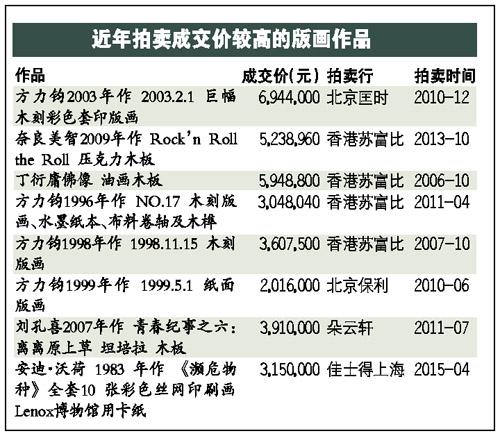 观察近年版画市场拍卖记录可以发现,不同名家的作品价格差异很大,比如自雅昌艺术网整理的版画拍卖记录前20名中,大部分是方力钧的作品,价格可达数百万元,而大部分的版画家作品中,大多数为数万元,少数可达十万元以上。曾先生认为,这种分化的原因是当代艺术家的版画价格以其油画作品作为对比的,所以油画价格高的版画价格也高。