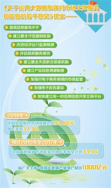 《意见》提出运用大数据提高为市场主体服务水平。潘文对此分析说,利用大数据等现代信息技术,可以增加政府信息公开透明度、提高注册登记效率、简化项目审批程序、有效综合评估企业信用状况、进行经济运行监测预测和风险预警等等。这些进步都有利于提升政府公共服务和监管的实时性和有效性,有利于方便市场主体,提高经济社会运行效率。