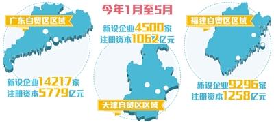 从市场反馈来看,各类市场主体高度青睐自贸区。沈丹阳介绍说,今年1月至5月,广东自贸区区域内新设企业14217家,注册资本5779亿元;天津自贸区区域内新设企业4500家,注册资本1062亿元;福建自贸区区域内新设企业9296家,注册资本1258亿元。