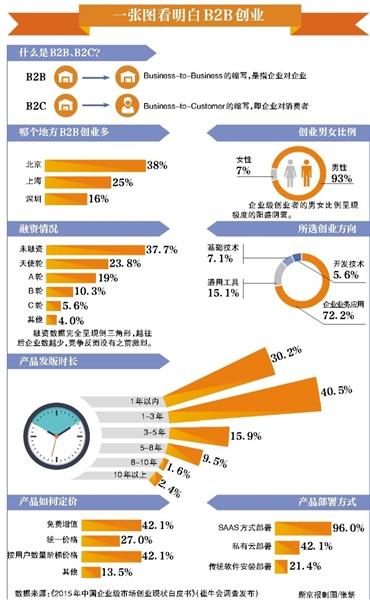 “现在的互联网创业浪潮有点类似于19世纪加州的淘金热。”B2B(企业对企业)创业项目“日志易”创始人陈军说,“别的创业公司(B2C,企业对消费者)是淘金的,我们卖水、卖牛仔裤、卖铲子、卖锄头,为他们提供工具和支持。”像陈军一样为“淘金者”服务的B2B创业项目日渐增多,但相比B2C的红海,B2B领域仍是一片蓝海。有机构曾公布过一个数据,美国企业数是2700万家,美国有三大企业服务领军公司,市值总和3500亿美元,而中国有约2200万家企业,却连一家估值十亿美元的B2B公司都没有。看起来,一块肥沃的市场正等待创客们。然而,机会真的来了吗?在风口上,是否可以高枕无忧?今天下午,新京报联手IDG资本,举办寻找中国创客论坛,以“席卷2015:B2B大风进行时”为主题,聚焦B2B领域创业。