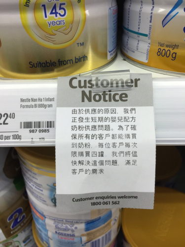 在澳洲最大连锁超市coles的一家分店,在婴儿奶粉区的货架上有一张醒目的、用中文打印的“敬告消费者”通知:“由于供应的原因,我们正发生短期的婴儿配方奶粉供应问题。为了确保所有客户购买到奶粉,每次客户限购四罐,我们将尽快解决这个问题,满足客户的需求。”而这张告示针对的是谁,答案显而易见。