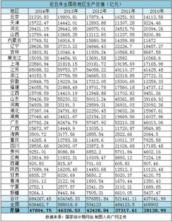 地方省市GDP之和再次超出全国已经不是什么新鲜事。从年度数据来看,此前几年也一直存在这个问题。央广网财经记者统计了近五年个省市的GDP数据发现,从2010年至2014年,官方发布的国内生产总值分别为408903、484123.5、534123、588018.8、636462.7亿元,而31省市的GDP数据之和却连年超出全国,2014年超出全国47804.75亿元,而且差额越来越大,呈逐年递增的态势。