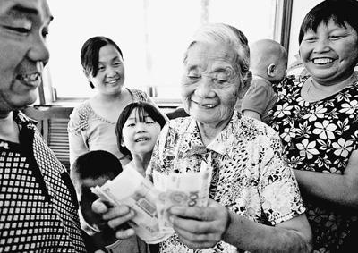 江西省婺源县紫阳镇梅林村年过80岁的汪奶奶,在村里年轻人的帮助下,通过农村远程自助柜员机,在村里领取了自己的养老金。卓忠伟 方永忠摄