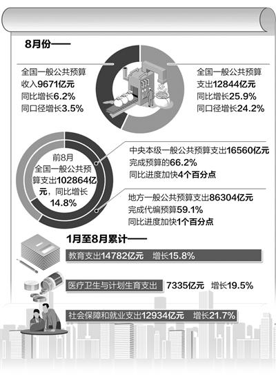 既加快支出进度,又注重支出结构和方式的优化,使得在财政收入增长放缓的情况下,民生等重点支出得到较好保障。1月至8月累计,教育支出14782亿元,增长15.8%;医疗卫生与计划生育支出7335亿元,增长19.5%;社会保障和就业支出12934亿元,增长21.7%。