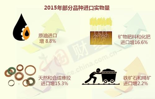 如果剔除价格因素,仅从进口实物量来看,还是增加的。去年我国原油进口量增加了8.8%,铁矿石和精矿的进口量增加了2.2%,矿物肥料和化肥增长了16.6%,天然和合成橡胶增长了15.3%。