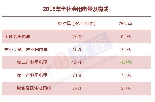 “全社会用电量”由第一产业、第二产业、第三产业用电以及居民生活用电四项构成,从历年的情况来看,第二产业用电量占总量的70%以上。2015年,第二产业用电量下降了1.4%。据中电联统计,这是第二产业用电量40年来的首次负增长;同时第三产业用电量和居民生活用电量分别增长了7.5%和5%。