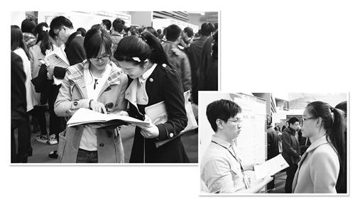 左图 3月17日,在清华大学举行的就业洽谈会上,两名求职者在查询招聘信息。 经济日报记者 韩秉志摄