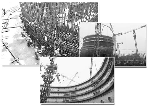 左上图 “华龙一号”示范项目福清核电站5号机组核岛反应堆厂房内部,工人正在紧张施工中。