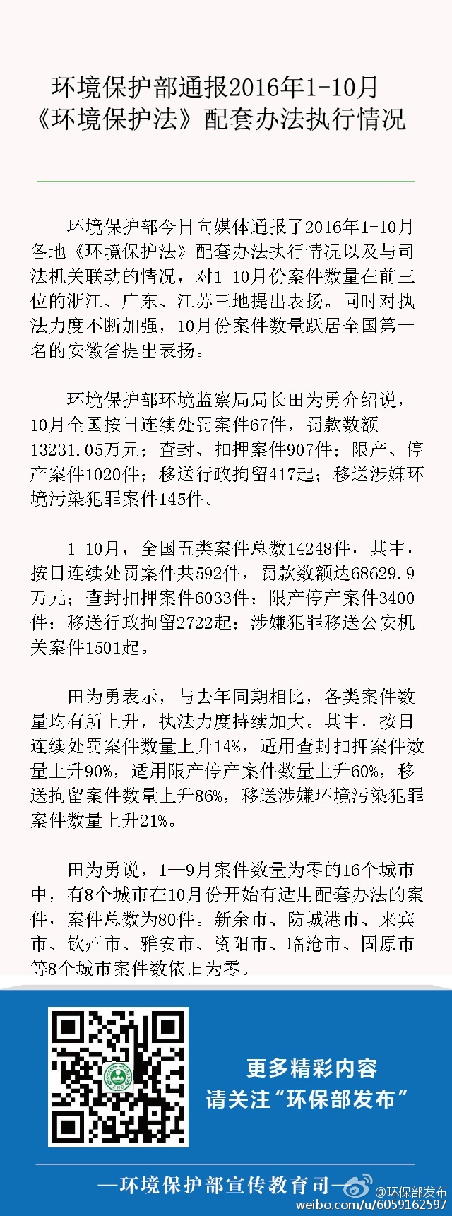 环保法配套办法执行情况:10月按日连续处罚案件67件