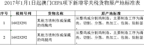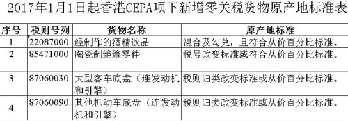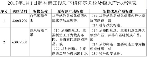 2017年香港澳门CEPA项下新增零关税货物原产地标准公布