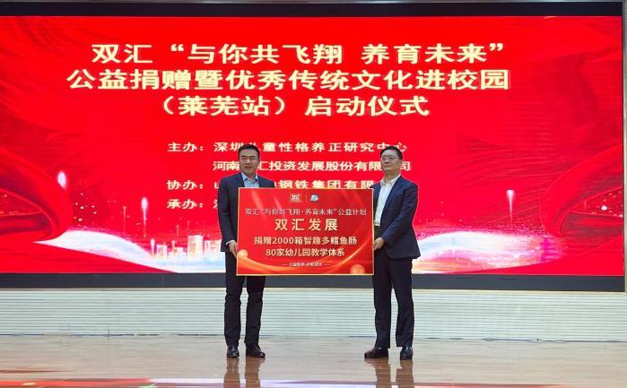 该活动走进革命老区山东沂源站时,北京东方君公益基金会带头帮扶了100家幼儿园。本次走进山东济南莱芜是继山东沂源、陕西汉中之后,双汇支持儿童教育公益计划的又一站。在本次公益活动中,山东泰山钢铁集团积极襄助,与双汇一起,共同向莱芜当地80所幼儿园定向捐赠双汇儿童产品智趣多鳕鱼肠及儿童性格涵养教学体系,以支持莱芜学前教育发展,助力少年儿童健康成长。