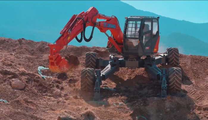 在空地联合营救灭火项目,徐工“钢铁螳螂”率先爬上陡坡开挖防火隔离带。