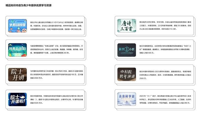 其中,抖音与少年儿童出版社、中国物理学会、中国科协、中国科学院、南开大学、西湖大学等机构合作推出《十万分好奇》、《抖来云逛馆》、《院士开讲》、《唐诗三百首》、《科学1小时》、《中科院跨年演讲》、《未来科学说》多档精品节目,为青少年提供了更多优质学习资源。