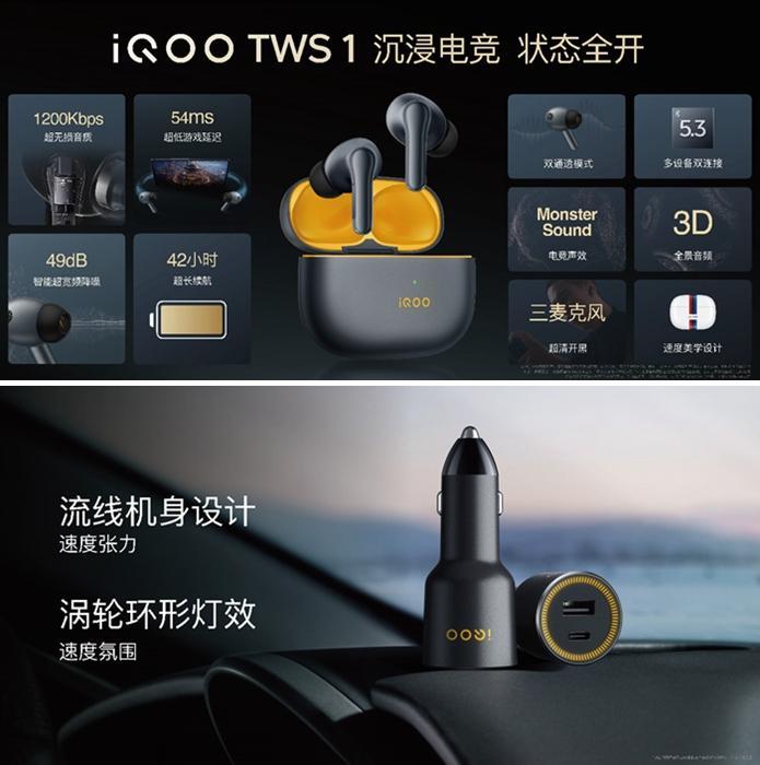 发布会上,iQOO TWS1和iQOO 80W双口车充同场亮相。iQOO TWS1单耳重量4.98g,支持端到端aptX Lossless无损传输,可以带来最高1200Kbps码流的超无损音质,并拥有自研超宽频声音单元。iQOO 80W双口车充采用涡轮环形灯效、C+A双口设计,支持最高80W的C口输出功率,内置14重专业保护技术。