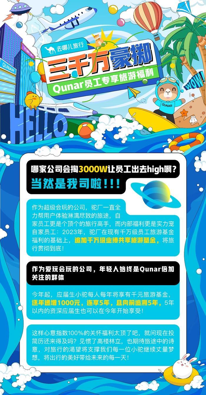 2023年,疫情结束,旅游恢复进入快车道,去哪儿希望员工也能出去走一走、看一看。为此,去哪儿宣布追加千万级业绩共享旅游基金,为出游助力。其中,针对应届生,除基础2400元员工旅行基金福利外,额外提供每人每年千元激励金,且逐年递增1000元,可连享5年,该笔预算已增至3000万。入职第5年的应届生可享5000元/人的旅游激励金。该政策向前追溯5年,这意味着入职第5年的资深应届生,可直接领取7400元旅游基金。