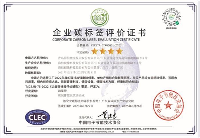 中国电子节能技术协会依据国内第一个以企业性质为主导的碳标签评价团体标准《企业碳标签评价通则》(T/DZJN75—2022),从企业碳排放强度降低率、单位产值综合能耗降低率、单位产品综合能耗降低率、可回收利用率、绿色供应商占比、低碳管理制度、低碳设备、低碳技术等方面,对企业进行定性和定量的综合评价,为海信激光显示股份有限公司颁发全国首个企业碳标签证书。