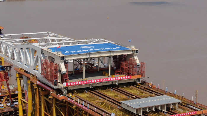 浙江永宁大桥首节1100吨钢梁顺利顶推