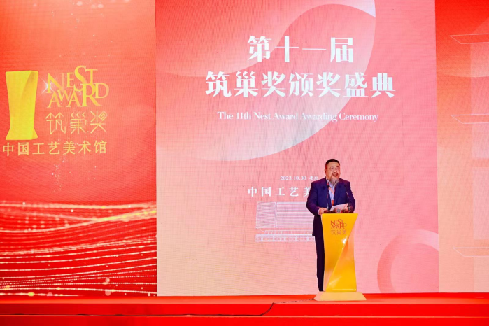 中国艺术研究院院长、党委副书记、中国工艺美术馆中国非物质文化遗产馆负责人周庆富,中国工艺美术馆中国非物质文化遗产馆副馆长魏大威、中国工艺美术馆中国非物质文化遗产馆党委副书记、副馆长王辉出席开展仪式,中国工艺美术馆中国非物质文化遗产馆副馆长、清华大学美术学院博士生导师、筑巢奖组委会常委苏丹致开幕词。展览总策划、筑巢奖组委会主席、清华大学美术学院副院长方晓风分享了展览的精彩看点并宣布第十一届筑巢奖颁奖盛典正式开启。