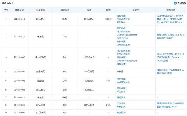2013年9月,SHEIN开启融资历程,获得集富亚洲500万美元A轮融资;两年后,IDG和景林资本共同发起B轮3亿元投资;紧接着在2016年初获得嘉远资本股权融资;2018年,SHEIN引入红杉中国和顺为资本的C轮融资,获得数亿美元,估值飙升至25亿美元。2019年-2020年,SHEIN获得D轮、E轮融资,投资方包括Tiger Global(老虎环球基金)、IDG、红杉中国等,估值翻达到150亿美元,成为独角兽。