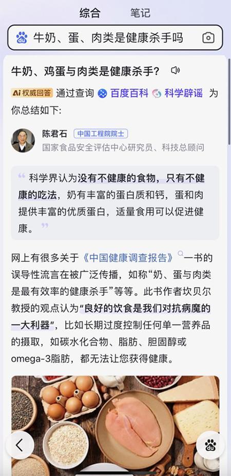 同时,百度百科也联动百度搜索,为权威知识的传递持续赋能,极致满足用户知识获取的需求,用户在百度APP里搜索相关问题时,“极致可信”的内容将以权威词条形式直达用户,精准匹配用户搜索需求,并在内容展示形式上,也做了丰富性提升。三维模型视频和高质量图片,可以帮助用户更好地直达真相。比如,用户搜索“拉蒂迈鱼有多大?”时,有关拉蒂迈鱼的三维模型视频会一并出现在展示信息里,让用户的内容需求即刻满足;当用户搜索“奶、蛋、肉类是健康杀手吗?”,结果呈现是由中国工程院院士给出的科学辟谣“没有不健康的食物,只有不健康的吃法”,击碎谣言,澄清事实,保障科学热词解读权威与准确。