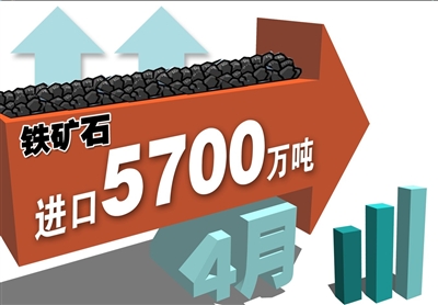 海关12日公布的数据显示,4月份,我国铁矿石进口5700万吨,创造了历史新高。我国铁矿石进口自1月以来连续4个月攀升,1-4月份合计进口铁矿石18846万吨,累计增长22.9%。