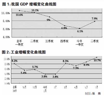先看农业,今年全国夏粮产量达到2467亿斤,比上年增长2.2%,连续6年增产。姚景源说,千万不要小看这个夏粮“六连增”,因为近百年来,中国粮食基本上都是5年一个周期——两丰两平一歉。夏粮丰收为今年国民经济平稳增长奠定了好的基础。再看第二产业,工业增长的曲线十分清晰地描述出,去年11、12月以及今年1、2月是中国经济最困难的4个月,目前已经是企稳向好的态势(图2)。最后看第三产业,保持了平稳较快增长的势头,上半年对国民经济增长的贡献率达到47.4%,比上年同期提高了6.2个百分点。