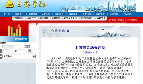 据上海金融办网站刊出的声明指出,《财经网》有关“上海将尝试个人海外投资”的报道,纯属“无中生有”,上海市金融服务办公室主任方星海,从未就此问题接受采访,对《财经网》不负责任的行为,表示遗憾。