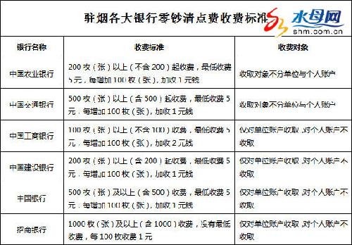 昨天下午,记者致电交通银行(601328)烟台分行客服电话,客服人员表示,无论对公或者对私账户,存取零钞超过一定数量,都将被按规定收取相应手续费。具体收费标准为:500枚(张)以上(含500)收费,最低收费5元,每增加100枚(张),加收1元钱。收取对象不分单位与个人账户。