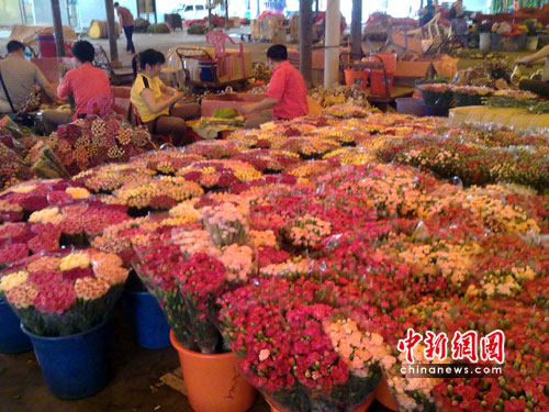 中新网广州5月7日电 (吴敏平)一年一度的母亲节将至,而在母亲节具有象征意义的康乃馨则顺理成章地得到了不少孝顺子女的垂青。今日笔者走访了位于广州市芳村大道的岭南花卉市场以及市内多家花店,发现除了康乃馨本身成为主调外,价格的攀升也成了主调。