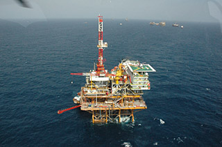图为墨西哥湾上的采油钻井。记者 陈恃雷 摄