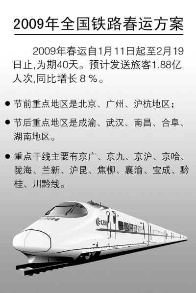 铁道部运输局提供的数据显示,2009年春运,节前旅客发送量高峰期为1月21日至24日(农历腊月二十六至二十九),高峰日发送旅客将达480万人次左右,同比增加30万人次左右。节后旅客发送量高峰为1月31日至2月4日(农历正月初六至初十),高峰日发送旅客将超过600万人次,同比增加40万人次左右。