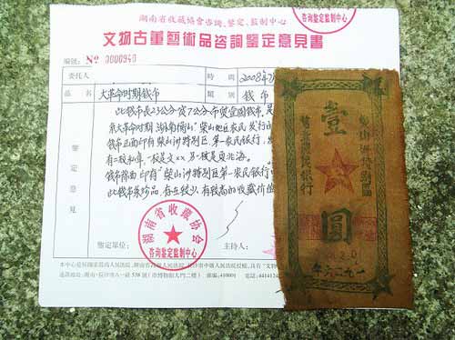一个月前,湖南省收藏协会理事吴膺五联合一些专家对这枚布币作了鉴定,确认它是大革命时期湖南农民运动过程中发行的第一套钱币之一,并出具了鉴定书。根据推断,这枚布币是1926年发行的,距今已有82年历史。