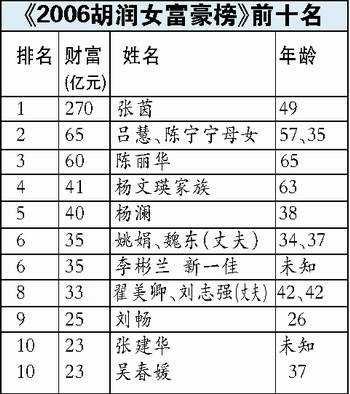 在胡润12日推出的《2006胡润女富豪榜》上,除了此前一天以270亿元登上胡润百富榜榜首的女富豪张茵继续占据榜首之外,吕慧和陈宁宁母女、陈丽华、杨文瑛家族、杨澜、姚娟和魏东(丈夫)、李彬兰、翟美卿和刘志强(丈夫)、刘畅、张建华、吴春媛位列二到十位。尽管这些名字中大多数都不为公众所知,但却都是响当当的亿万富婆。排名第十的吴春媛身价超过23亿,此次入围女富豪资本之雄厚可见一斑。