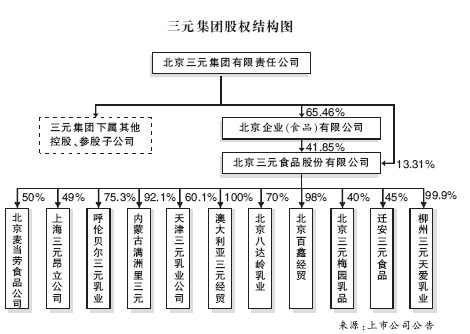 今年是三元集团成立60周年。据公开资料显示,三元集团是经北京市政府授权经营的国有独资公司,该集团现拥有总资产100亿元,下辖13个国营农场、20家专业公司、22家中外合资合作企业、4家境外公司,其中三元食品股份有限公司已在国内A股上市。