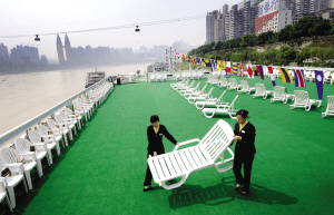 走上舱顶,是视野开阔的阳光甲板,占据了整艘游轮的一半,比一个篮球场还大。游客可以坐在沙滩椅上,毫无障碍地欣赏长江三峡的壮丽景色。