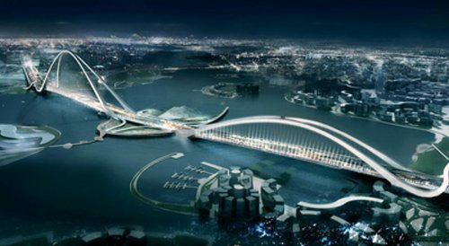 迪拜正在建设国内首座,也是世界上最大和最高的拱桥。这张俯瞰图是纽约建筑公司fxfowle的设计图。这座桥梁于2008年3月开始施工,有望在2012年竣工。
