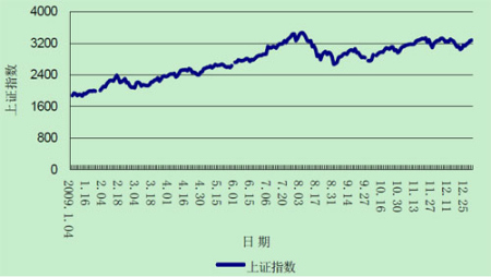 2009年,股票指数总体上行。股指自2008年11月份反弹以来,逐级震荡走高,至2009年8月份见顶后出现调整,随后震荡上行。2009年末上证指数收于3277.14点,与2008年底的1820.81点相比,上涨1456.33点,涨幅达80%。本年,上证指数最高为3478.01点,最低为1844.09点,波幅为1633.92点。