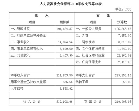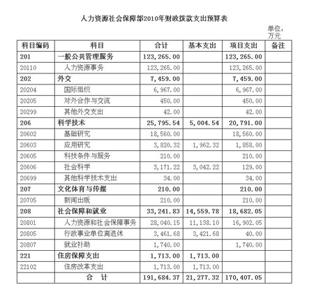 据人社部网站消息显示,根据《财政部关于批复人力资源和社会保障部2010年部门预算的通知》(财预[2010]205号),人社部2010年预算情况如下: