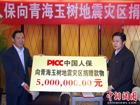 4月16日上午9时,从北京抵达青海的中国人民财产保险股份有限公司副总裁贾海茂,代表中国人保集团在西宁向青海玉树地震灾区捐赠款物500万元,其中400万元现金捐款已由中国人保账户即时划款至青海省财政厅玉树抗震救灾捐赠资金账户。青海省人民政府副省长高云龙代表省政府接受了捐赠,并对中国人保给予的及时援助表示感谢。