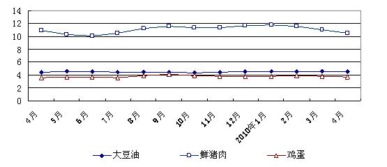 食品价格涨跌互现。4月份,36个大中城市集市早籼米、晚籼米、粳米、富强粉、标准粉平均零售价格分别为每500克1.66元、1.76元、2.13元、1.76元、1.57元,与上月相比分别上涨0.04元、0.05元、0.08元、0.02元、0.01元。大中城市集市猪精瘦肉平均零售价格为每500克10.54元,比上月下降4.54%,比去年同期下降4.11%。散装豆油、菜籽油和5升桶装大豆调和油、花生油零售价格分别为4.54元/500克、5.13元/500克、52.47元/桶、91.75元/桶,与上月相比,散装豆油和桶装大豆调和油价格分别下降0.66%和上涨0.27%,散装菜籽油、桶装花生油价格基本持平;与去年同期相比,两种散装油和桶装大豆调和油价格分别上涨1.11%、4.48%、2.42%,桶装花生油价格下降5.19%。监测的15种蔬菜月平均零售价格为每500克2.76元,比上月上涨2.22%,比去年同期上涨20.5%。