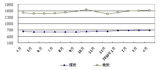 煤炭价格总体平稳。4月份,主产省煤炭平均出矿价格为每吨714元,与3月份基本持平。其中,动力煤平均价格为每吨525元,比3月份略降0.64%;主产省焦炭平均出厂价格为每吨1565元,比3月份上涨0.89%。主要煤炭中转港秦皇岛港3月份动力煤平仓价每吨640元,比3月份略涨0.46%。