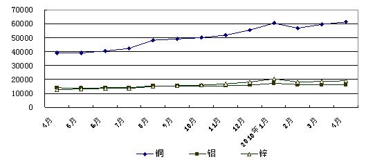 有色金属价格小幅上涨。据对大中城市有色金属现货市场监测,4月份六种有色金属综合平均价格比上月上涨2.46%。其中,电解铜、铝、铅、锌、锡、镍平均价格分别为每吨61409元、16571元、16493元、18991元、139414元、17.66万元,比3月份分别上涨3.41%、0.22%、0.49%、2.36%、2.56%、11.21%。