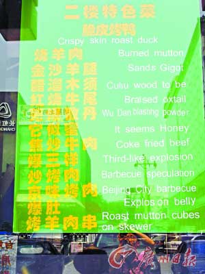 在《中文菜单英文译法》出台之前,北京中式餐馆常常开起“国际玩笑”,比如红烧狮子头被译成“RedBurnedLionHead”(烧红了的狮子头),“驴打滚”被译成“Rollingdonkey”(打滚的驴),“老虎菜”被错译成“tigerdish”(老虎做的菜),“童子鸡”被译成“Chickenwithoutsexuallife”(没有性生活的鸡)。老外们往往啼笑皆非或吓得不轻。