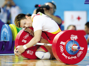 图:举重冠军张湘祥吻过的杠铃