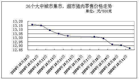 中新网11月3日电 据国家发改委网站消息,国家发改委价格监测中心监测显示,上周(2008.10.27-2008.10.31,下同)全国36个大中城市集市、超市猪肉(精瘦肉)平均零售价格每500克为12.94元,与前一周(2008.10.20-2008.10.24,下同)相比下降1.18%。