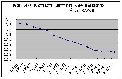 中新网2月23日电 据国家发展改革委价格监测中心监测,上周(2009年2月16日~2009年2月20日,下同)全国36个大中城市集市、超市猪肉(精瘦肉)平均零售价格每500克为12.78元,与前一周(2009年2月9日~2009年2月13日,下同)相比下降1.62%。