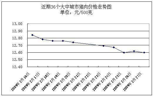 中新网3月2日电 据国家发展改革委价格监测中心监测,上周(2009.2.23-2009.2.27,下同)全国36个大中城市集市、超市猪肉(精瘦肉)平均零售价格每500克为12.64元,与前一周(2009.2.16-2009.2.20,下同)相比下降1.10%。